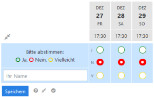 Aller Anfang ist eine Xoyondo-Umfrage, die klären soll, ob wir uns am 27., 28. oder 29. Dezember 2024 treffen werden.